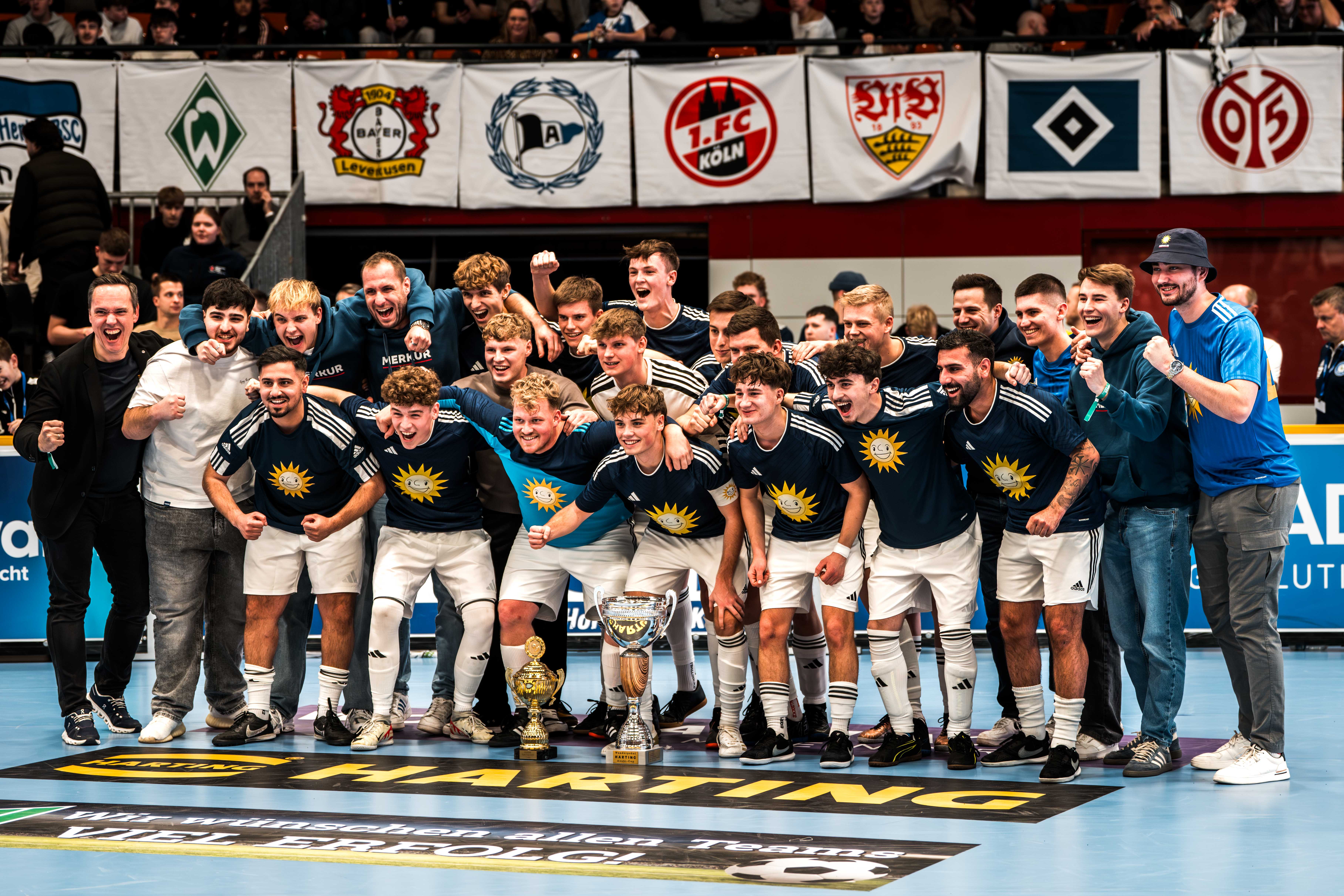 Die Auszubildenden der Merkur Group sind beim Fußball das Maß aller Dinge: Beim Harting-Azubi-Cup sicherten sich die Kicker mit der lachenden Sonne den begehrten Pokal. In einem packenden Finale bezwangen sie das Team der Firma Hettich aus Kirchlengern nach Treffern von Daniel Klipenstein und Civan Ertem mit 2:0.