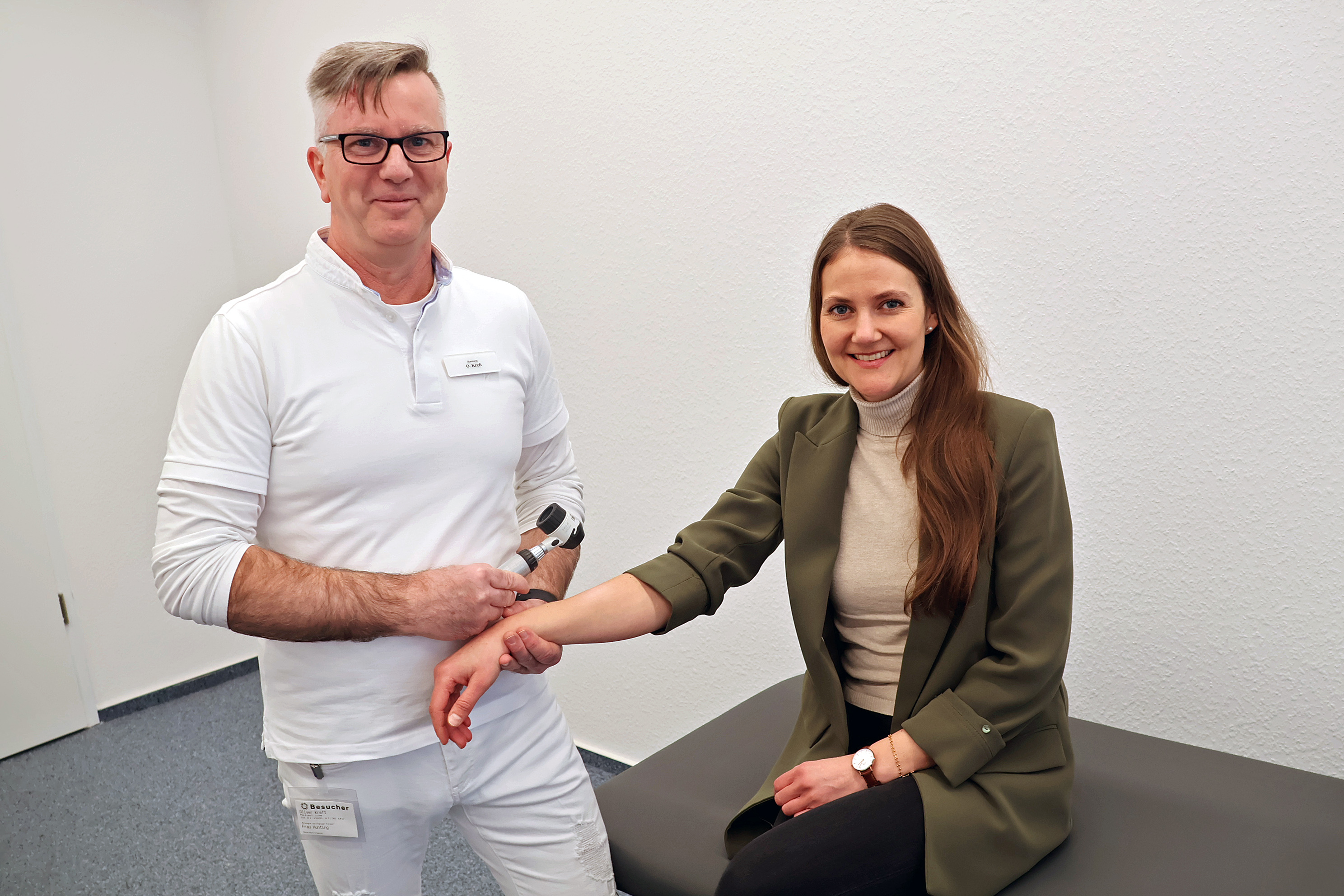 „Weil Hautarzttermine nicht selten sechs Monate Vorlauf haben, sind wir dazu übergegangen, Vorsorgeuntersuchungen unkompliziert im Rahmen der Arbeitszeit anzubieten“, berichtet Nadine Hunting vom betrieblichen Gesundheitsmanagement der Merkur Group. „Das Feedback ist sehr gut, die Termine sind immer schnell vergriffen.“ Sie selbst nutzte ebenfalls das Angebot. „Alles gut“, bescheinigt ihr Oliver Kreft – und bittet den nächsten Merkur-Mitarbeiter ins Untersuchungszimmer.