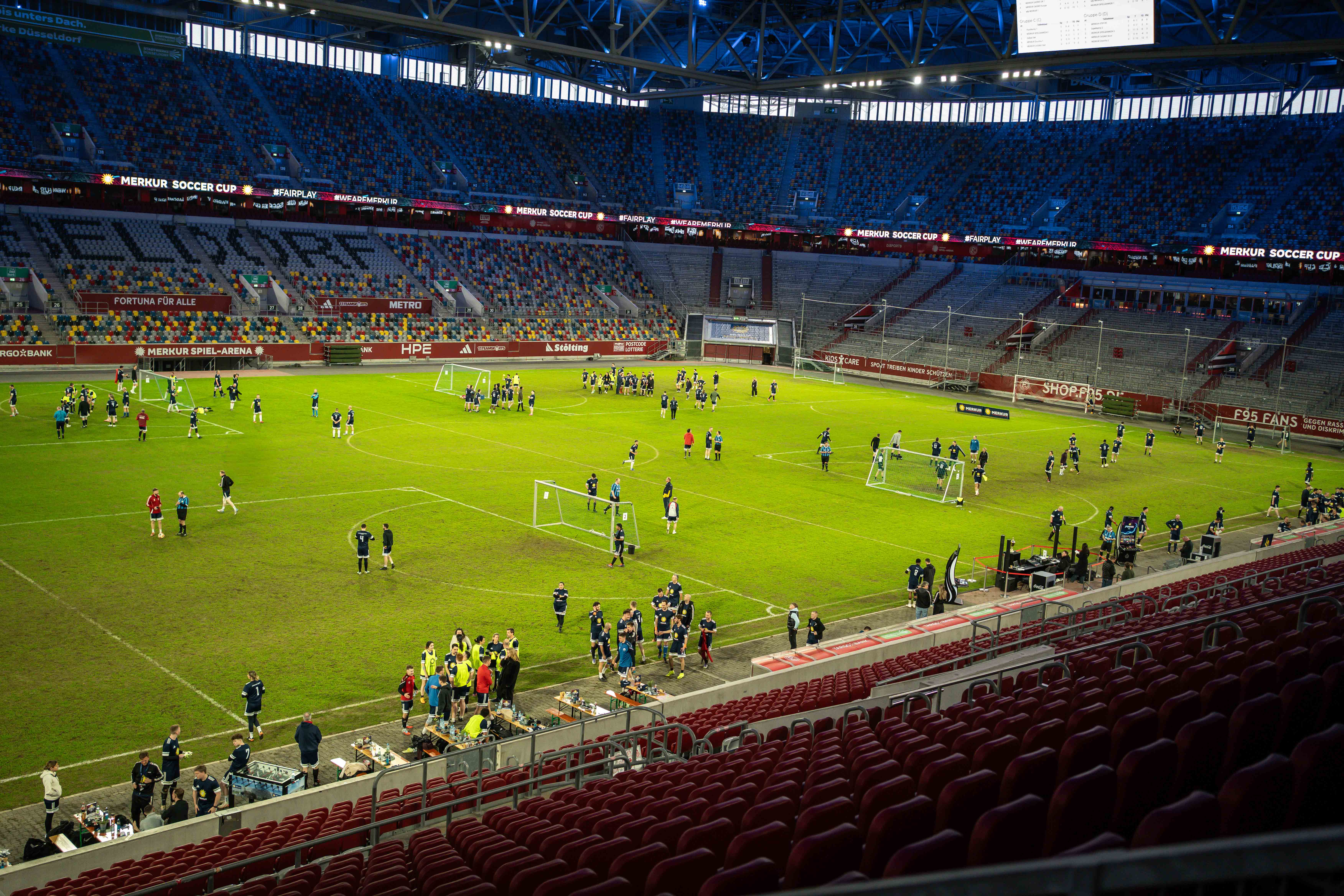 Nach einem gemeinsamen Warm-up – geleitet von Fortuna Düsseldorf-Athletiktrainer Moritz Barfknecht – erfolgte der Anpfiff der Gruppenphase. In dieser traten 20 Teams auf dem Kleinfeld in vier Gruppen gegeneinander an, in denen sich die vier besten Mannschaften für die anschließende K.-o.-Runde qualifizierten. Während Sportjournalistin Kamila Benschop als Moderatorin durch das Turnier führte und die Merkur Cheerleader mit ihren Auftritten für zusätzliche Stimmung sorgten, steuerte das Turnier auf seinen Höhepunkt zu: das Finale. In einem fesselnden Match zwischen Merkur Xtip aus Serbien und einer Vertretung der Merkur Spielbanken setzte sich am Ende die spielstarke Mannschaft von der Balkanhalbinsel durch und durfte nach einem 3:0-Erfolg verdient den Siegerpokal in den Düsseldorfer Abendhimmel recken. Im Spiel um Platz Drei triumphierte eine Auswahl der Firmenzentrale aus Espelkamp.